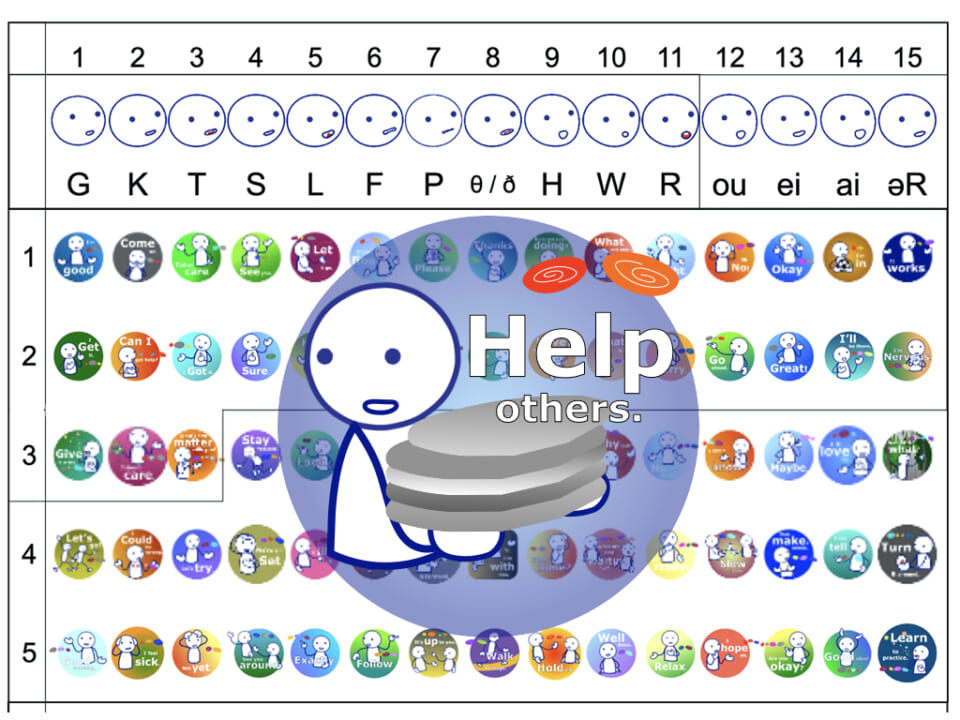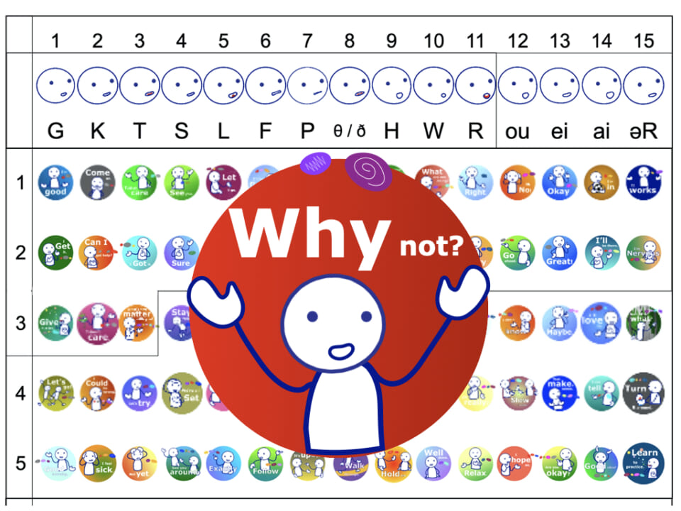音・リズムと表現のセンスを身につけるためのスタンプシードを使った、miniルーティンプラクティスの全体像。150のセリフが、縦(道筋にそった音の系列 x 横 (頻度・応用度の高い表現)で構成されます。身ぶり・手ぶり、情景の絵図、手本シード音声、円符(音の視覚イメージ)を組み合わせた画期的なツール、3周目です。