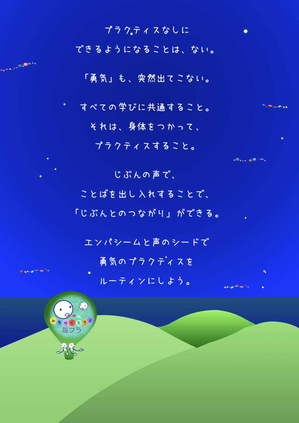 プラクティスをせずに上手にできることはありません。突然「勇気を出す」というわけにはいきません。すべての学びに共通すること。それは身体を使ってプラクティスすることです。身体使って、ことばを出し入れすることで「じぶんとのつながり」ができます。毎日お届けする、エンパレットとシードで勇気のプラクティスをルーティンに。