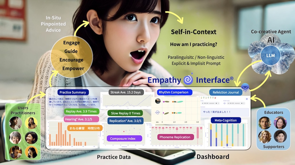 Out of this pursuit emerged a family of patented inventions—Hearing Mirror®, Rhythm Mirror®, Context Mirror®, together with the Empathy Interface® that connects them. These Mirrors make the invisible visible—revealing elements such as voice, demeanor, cognition, and surrounding contexts —and turning them into something observable in practice. These are not merely tools, but a co-creative framework that bridges the practitioner’s self-agency with the empathetic agency of educators and researchers who observe, support, and reflect on practice. By “empathetic,” I mean that beyond explicit exchanges of merely giving answers, humans and AI—and humans with one another—can share implicit signals of context, intention, and presence. The mirror does not judge. It simply shows what is happening now, in the past, and what may come next, at any time.