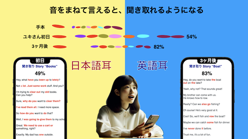 聞き取れないセリフは、じぶんで発話した時のリズムミラーに現れます。お手本とじぶんの頭の中に大きなギャップがあります。お手本とのギャップが縮まっていくと、聞こえるようになります。聞き取れるようになる過程で、発話のリズムミラーに現れます。