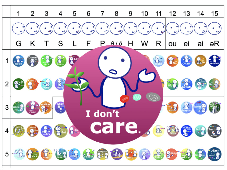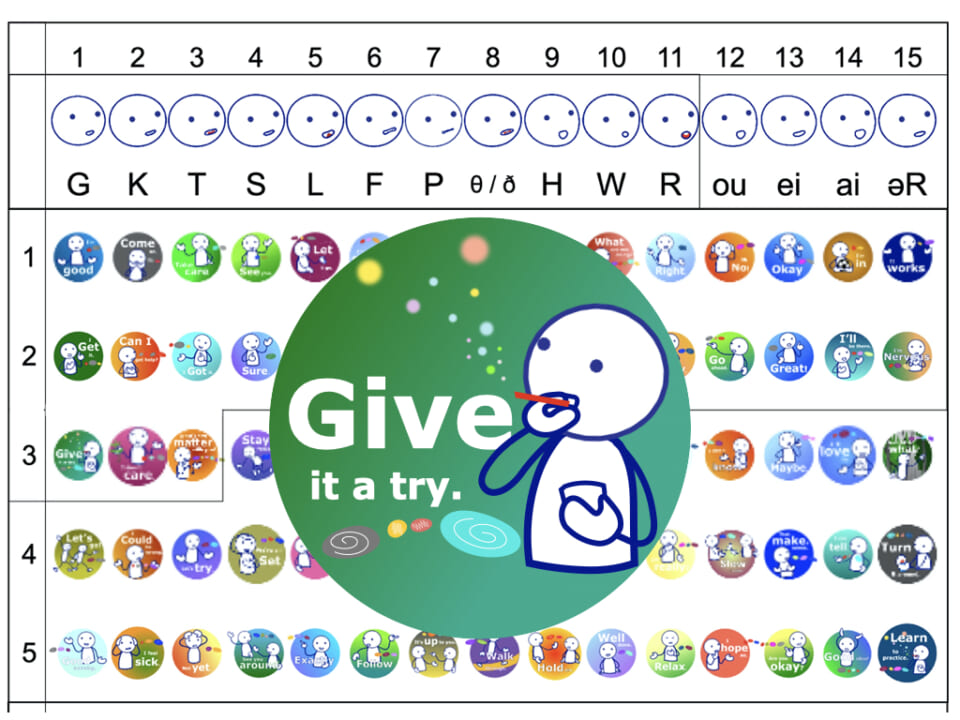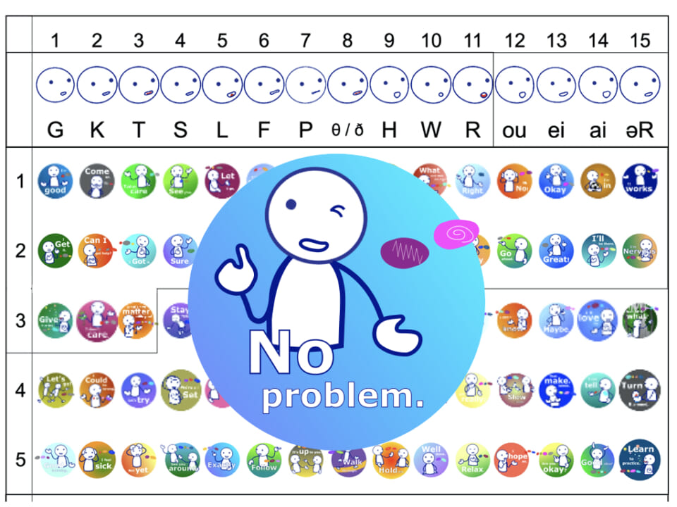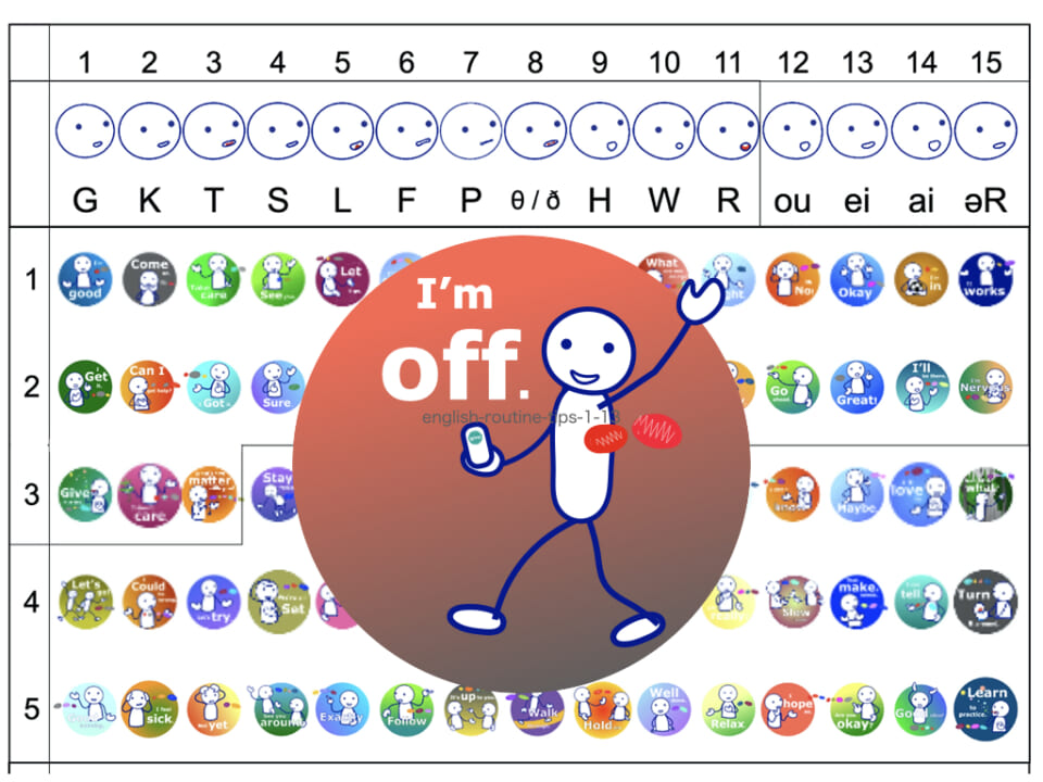 音・リズムと表現のセンスを身につけるためのスタンプシードを使った、miniルーティンプラクティスの全体像。150のセリフが、縦(道筋にそった音の系列 x 横 (頻度・応用度の高い表現)で構成されます。身ぶり・手ぶり、情景の絵図、手本シード音声、円符(音の視覚イメージ)を組み合わせた画期的なツールです。はじめの1周から。