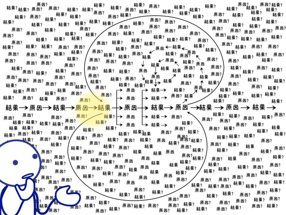 原因→結果で考えるのが常識とされます。でも実は、世界はそうなっていません。原因も結果もひとつではありません。ある結果があった時に原因だと、ほんの一部分を(じぶんで勝手に)切り取ってそのように決めているだけ。何かをやれば、やりなおすことができます。後からつながりができます。やらなかったことは、やりなおすことができません。