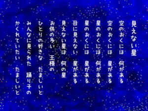 夜にならないと星は見えません。暗くなるおかげ、晴れているおかげで星が見えます。空を見あげないと星は見えません。上を向くから星が見えます。近すぎて見えない星があります。じぶんの足元の星、地球。星が見えるなんてあたりまえ、星を見上げたところで何も起きない。と思っていても、気づけることがたくさんあります。今晩かもしれません。