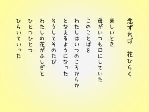 あなたは、どちらですか?「念じたって、花なんて咲かないよ。」それとも「思いをこめれば、願いはかなうんだ。」声にだすと気づくでしょう。念ずるとは、大切にすることばを、ひと息の声に出して唱えることです。信じることばを、くりかえし、ふりかえり、じぶん自身とつないでいくことです。すると、ひとつずつ、ひらいていく花に出会えます。