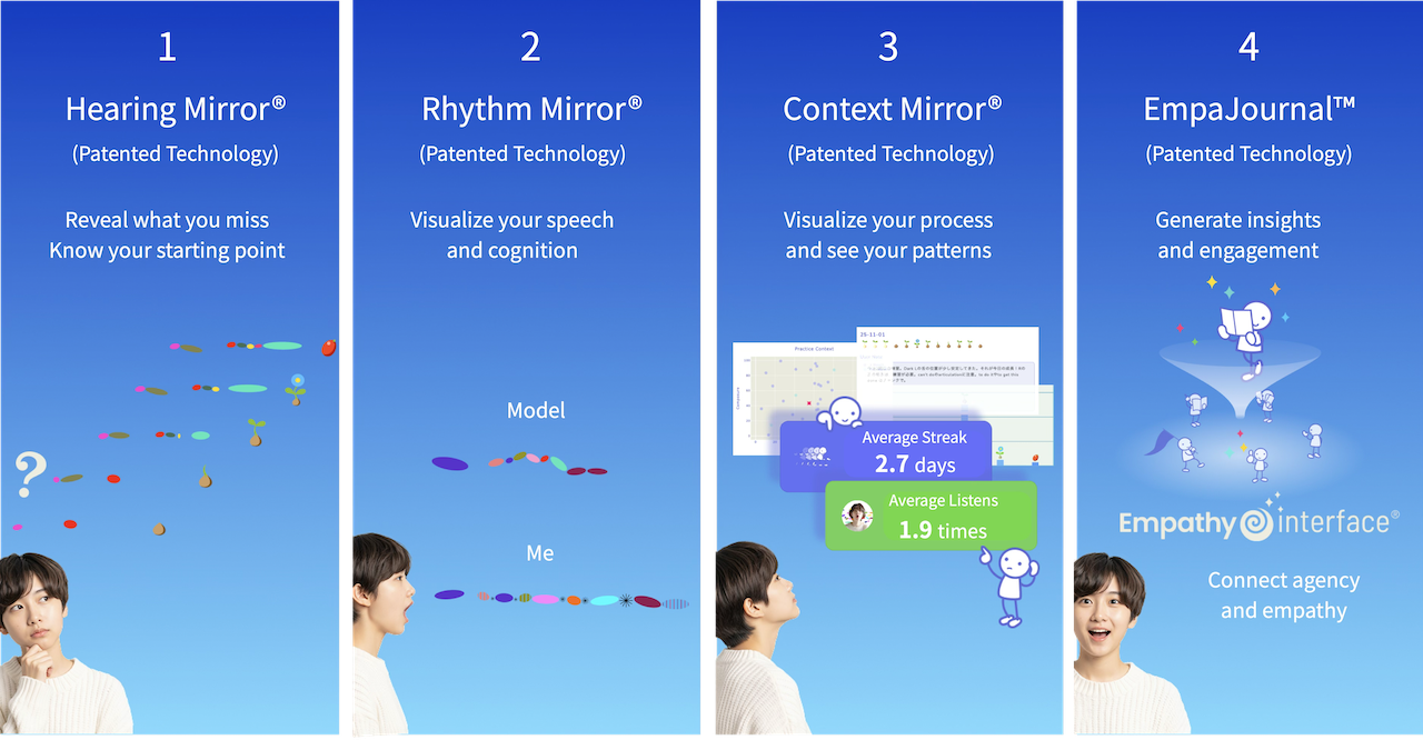 In 2018, we began service development in Japan, bringing our technologies from research into real-world applications. This year, we launched English Ear° Trail®—a platform that helps learners and educators build daily practice routines and experience English sounds and rhythm in new ways. Our products provide real-time and continuous feedback to encourage consistent, joyful learning.