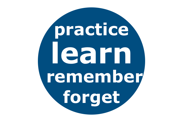 learnは、学ぶ。studyは勉強。rememberは思い出す、forgetは忘れる。practiceは、日頃、習慣的にすること、練習。