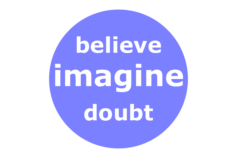 believeは、信じる、そのように思う。doubtは疑う、そのように思わない。imagineは、想像して思う。