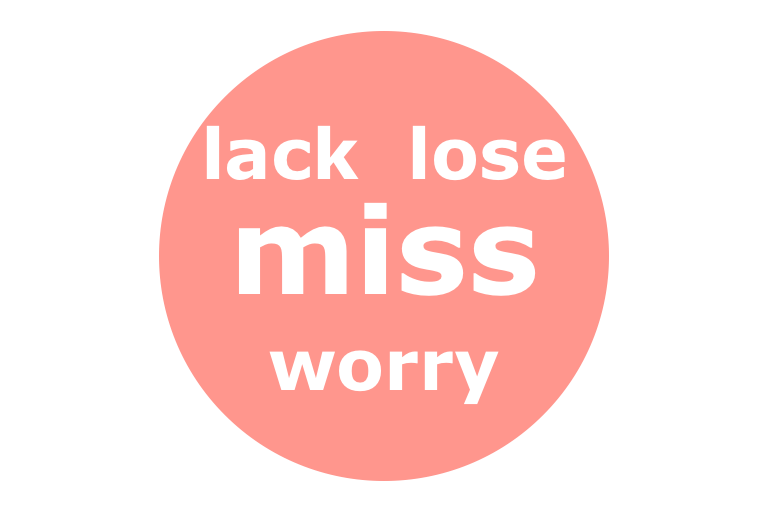 missは、取り損なう。ないことに気づく。lackは、欠く、もっていない。loseは失う。worryは気にかける。