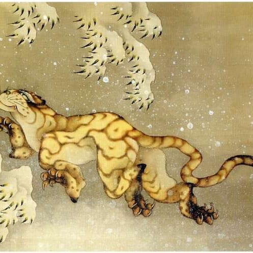見ているうちに、もう、雪中に飛翔する虎になっています。「86歳になって、ますます腕は上達し、90歳ともなると奥義を極めた。100歳を超えて描く一点は一つの命を得たかのように生きたものとなろう。長寿の神よ、私のことばがいつわりでないことを、ご覧ください。」葛飾北斎、絶筆の作品『雪中虎図』。88歳で描いた、じぶんの姿です。