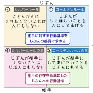 縦軸(じぶん・相手)、横軸(する・しない)を組み合わせてできた4つの窓で、気づくことがあります。ゴールデンルールの奥の窓(相手にしてあげたいと思うことはじぶんにもする)とシルバールールの奥の窓(相手にしないことは、じぶんにもしない)があります。実は、人のことを先に考えているようでも、それはじぶん中心の発想だったのです。