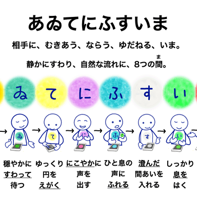 エンパシームにゆだね、自然な流れをつくるだけで、知識や情報を過剰に取り込むスマホの生活が変わります。静かにすわり、ひと息の声をだすひと時が、日ごとの糧に変わります。「み・ち・ゆ・く・と・き・よ」の7文字に表された、小さなルーティン。ゆだねて、順にたどることで、ふりかえるチカラ、よりそうチカラを活かすことができます。