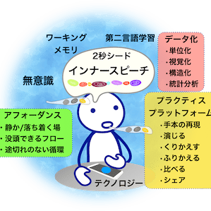 エンパシーム研究開発と参照領域を整理図にしてみました。左側①②はじぶん。右側③④はじぶんの周囲、社会・環境。上側①③は心とことばの世界。下側②④は身体を使った、環境との相互作用の世界。中心部分がエンパシームが提供するテクノロジーとメソッドです。また、インナースピーチに関わるエンパレット集のページとして参照ください。