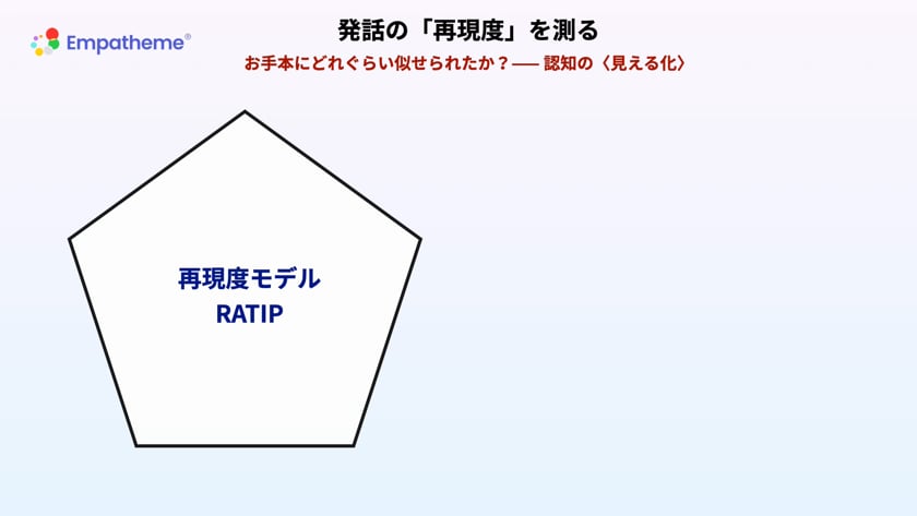 発話の再現度を測るお手本にどれぐらい似せられたか? 発話の再現度を測る from Empatheme —— 認知の〈見える化〉—— エンパシームは、発話の視覚化(特許技術)と、再現度モデル(データサイエンス)により、認知の〈見える化〉を実現します。お手本をまねるごとに、どれぐらい似ているかをビジュアル表現に変えます。あなたの肉声でまくセリフのタネ(シード)がどれぐらい育つか、遊ぶように楽しながら、手本に近づけるプラクティスになります! シェア Share on FacebookShare on Facebook Share on XShare on X