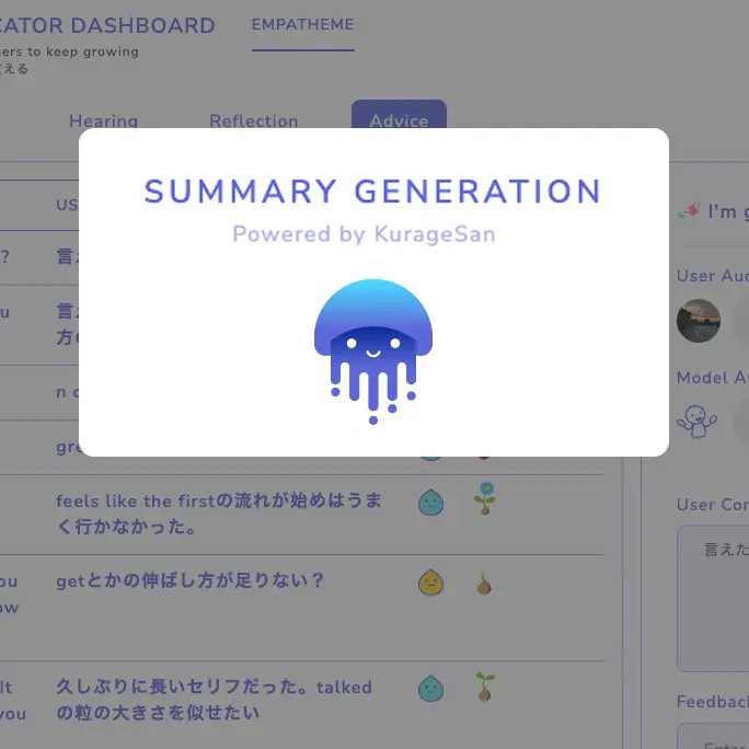 The embedded Empathetic AI “KurageSan®” provides concise summaries of each practice session, highlighting key actions and tendencies.