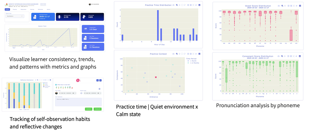 By combining these acoustic indicators with the learner’s self-observation and reflection trends, the Dashboard supports deep insight into evolving cognition.