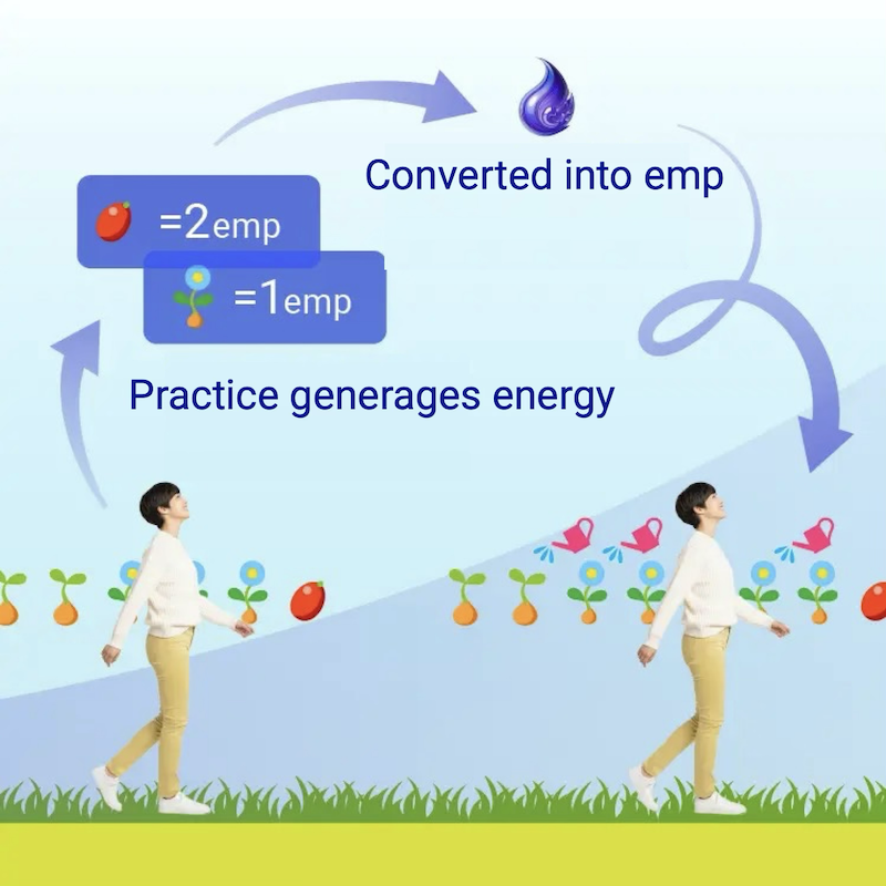 “emp” stands for Empathetic Moment by Practice. It’s a Practice Energy Coin that visualizes the motivation and energy generated by your practice. Circulating within English Ear° Trail®, emp acts as a fuel powering a virtuous circle: Practice → Energy Generation → More Practice.