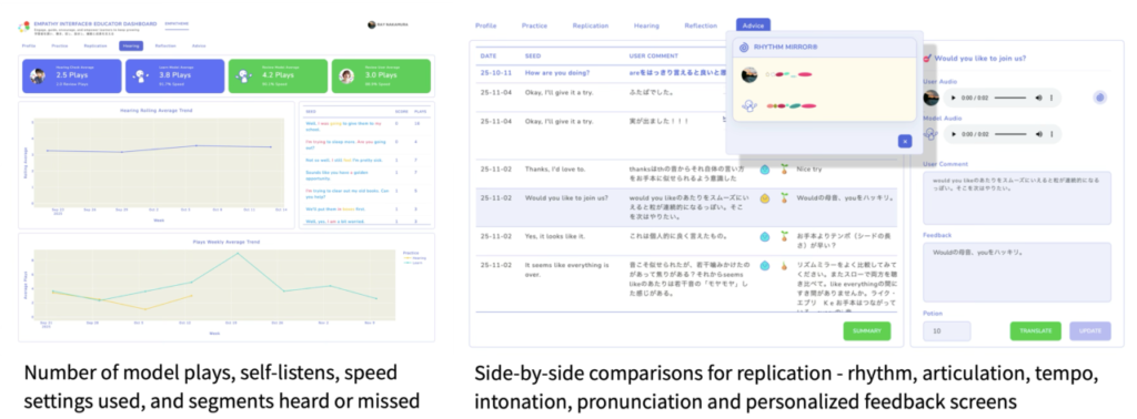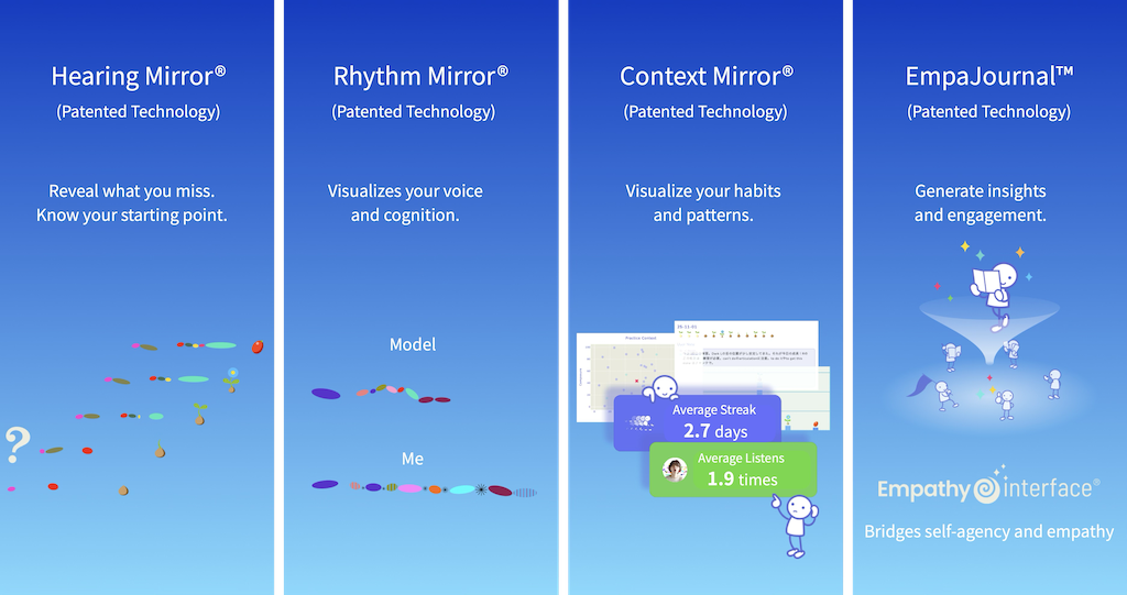 Designed for English learners and those who support them, the patented Empathy🌀Interface®” bridges the app and dashboard, creating a collaborative space where learners’ daily practice meets educators’ and supporters’ real-time guidance. With researchers also able to participate, Empatheme English Ear° Trail® provides an innovative infrastructure for learners, teachers, supporters, and researchers to advance language learning together.