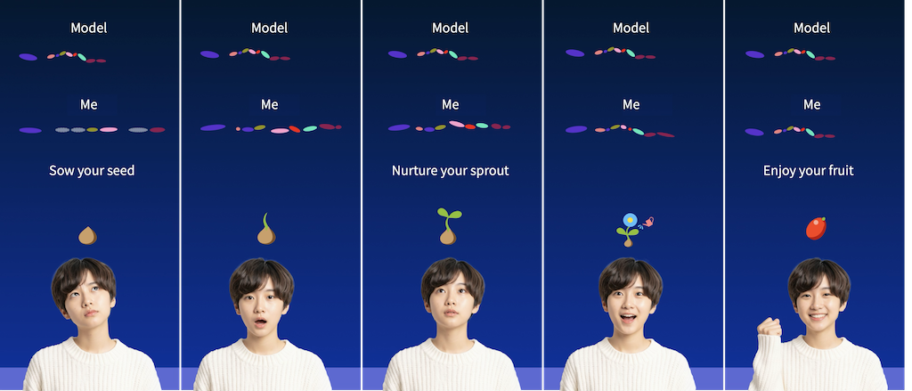Visualizes rhythm, articulation, tempo, intonation, and pronunciation. Your voice is reflected syllable by syllable in real time, allowing you to instantly see your recordings, A/B comparisons with the model, and progress over time.