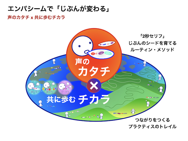 じぶんが変わるとは、できなかったことが、できるようになること。むずかしいと思っていたことが、やさしくなること。エンパシームは、あなたの「じぶんを変える」チカラになります。変わるチカラの元、あなたの身体の中と、身の周りにあります。エンパシームは、あなたの肉声にカタチに変え、つながりを身につけるチカラを生み出します。